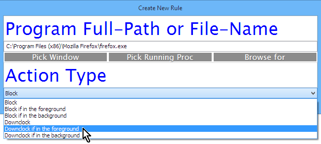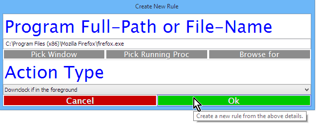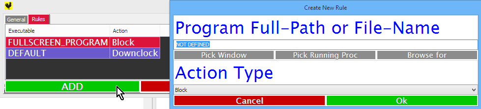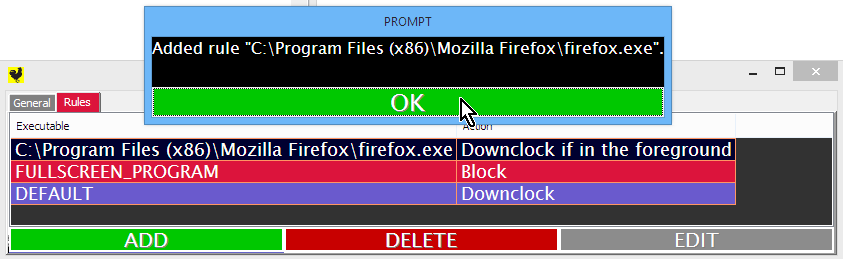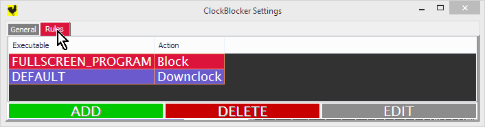 Rules in this page are evaluated in a top-down order. The first rule to match stops evaluation of further rules (you might think of this like the firewall config page on a router). In this case the default (or catch-all) rule is to downclock, which is probably what's happening right now for you (no impact of running ClockBlocker). If however, we were to run a fullscreen application, then the above rule ("FULLSCREEN_PROGRAM") would take priority and we would block downclocking (lock the card at high clock speeds). In otherwords, right now we could fire up a game and ClockBlocker would already do something.. Yet it's also important to note that ClockBlocker will not distinguish between any special cases of fullscreen applications, and will also block downclocking for web-browsers.