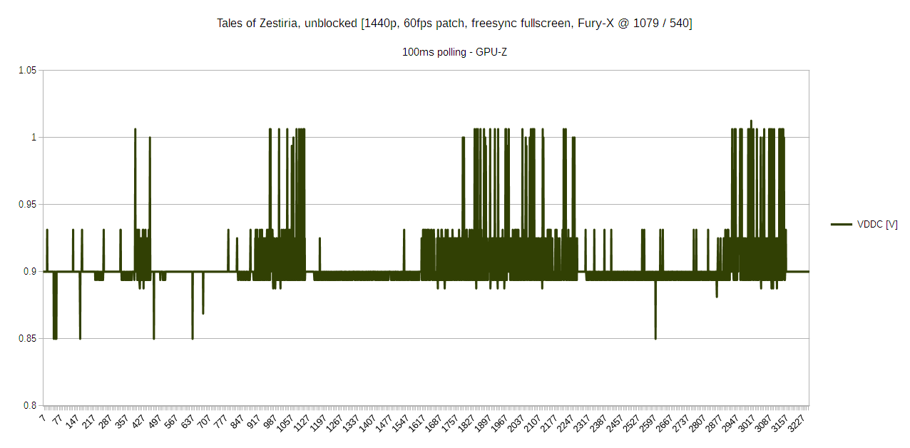 Provided is a plot of voltage and clocks through some random encounters in Tales of Zestiria, a low GPU usage JRPG (Japanese RPG). The data for these plots was logged using GPU-Z, which is an absolutely great tool. I strongly recommend using GPU-Z, MSI-Afterburner, or Sapphire TriXX to verify your clock speeds in games.