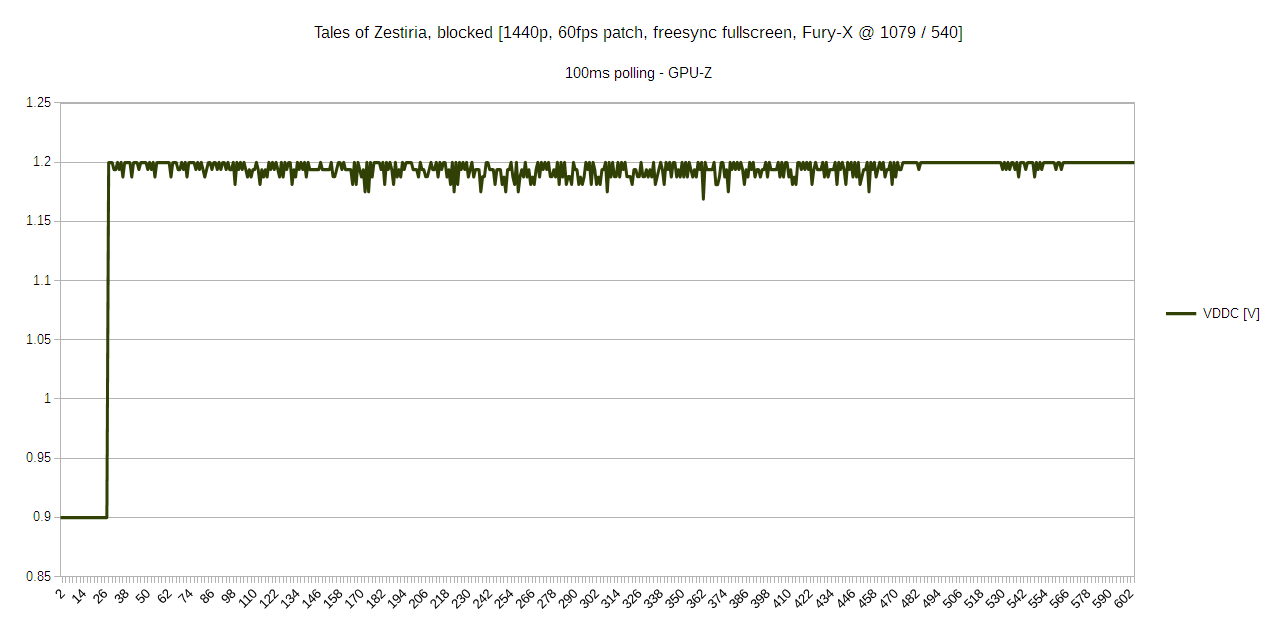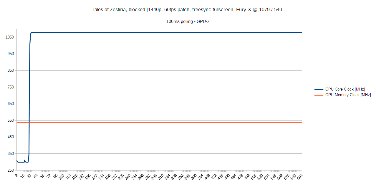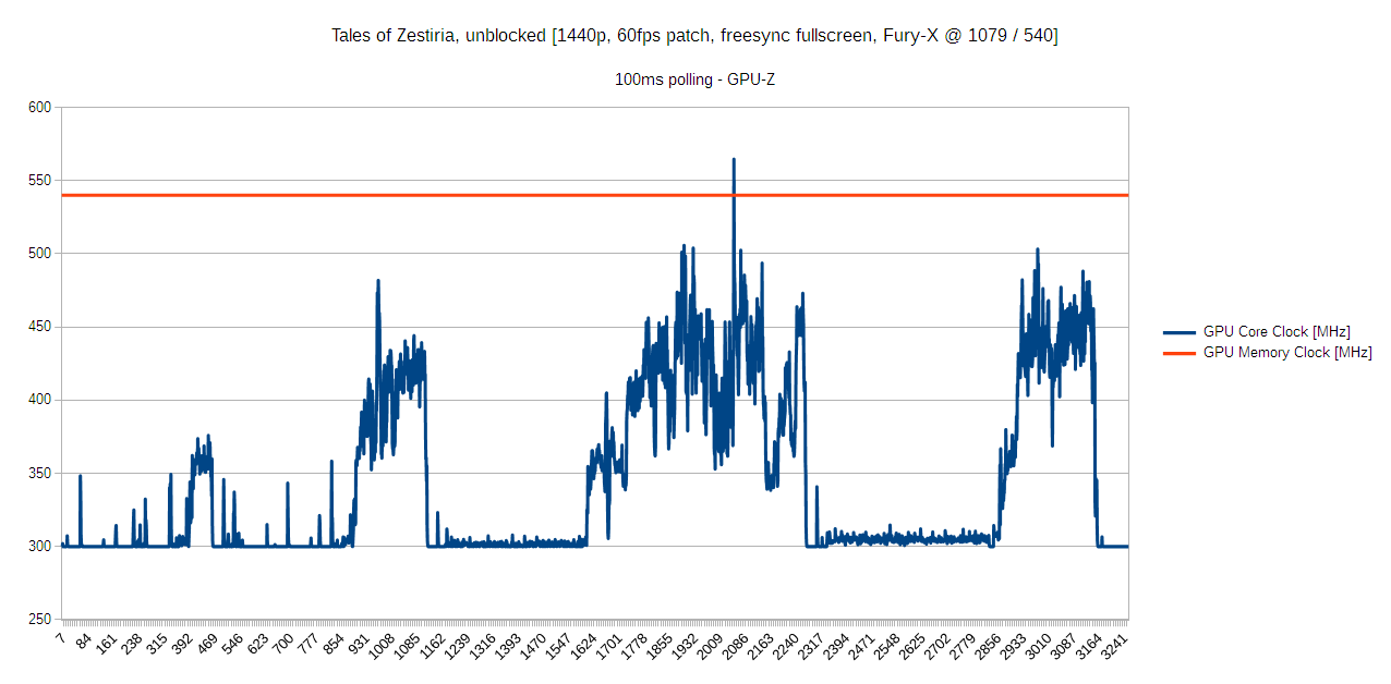Provided is a plot of voltage and clocks through some random encounters in Tales of Zestiria, a low GPU usage JRPG (Japanese RPG). The data for these plots was logged using GPU-Z, which is an absolutely great tool. I strongly recommend using GPU-Z, MSI-Afterburner, or Sapphire TriXX to verify your clock speeds in games.