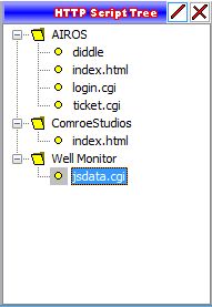 The entries operate as controls to the HTML Script Panel. Selecting / highlighting an HTML script from a branch bearing the name of an HTML page copies that script to the HTML Script Panel. Selecting / highlighting a tree root bearing the name of an HTML script file performs no action.