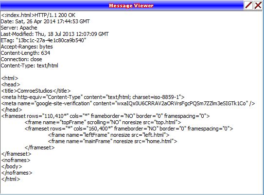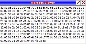 | The messsage viewer panel is a display only panel. It has no controls and acts as control to no other panel. Depending upon the selected / highlighted message in the messsage log, it displays selected message contents in either hex or ascii. Messages labeled ping and snmp in the message log are displayed in hex, while messages labeled http are displayed in ascii. |