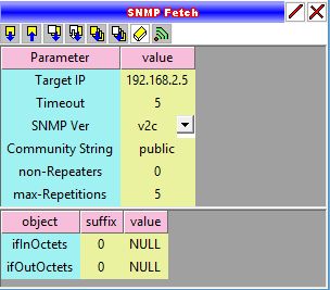| Send an SNMP request to an SNMP agent, or send an ICMP ping to an IP. The panel is composed of an upper portion with a fixed set of settings, and a variable length lower portion enumerating a list of object | suffix | values. |