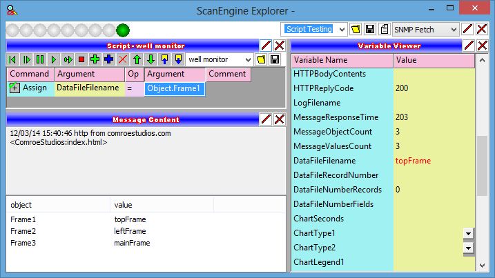 Whether objects have been scraped from a received webpage, or objects have been parsed from an SNMP message, objects in the Message Contents panel can be acted upon by script. Whenever there are contents in the Message Contents panel (scraped from a webpage or received SNMP message), any expression on the script panel can reference those object values.