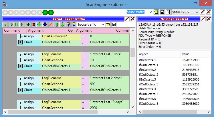 Whether objects have been scraped from a received webpage, or objects have been parsed from an SNMP message, objects in the Message Contents panel can be acted upon by script. Whenever there are contents in the Message Contents panel (scraped from a webpage or received SNMP message), any expression on the script panel can reference those object values.