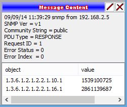 If no MIB definition files nor roots are loaded, ScanEngine Explorer will work with MIBs on a completely numeric OID basis. For example, were no roots nor MIB definition files loaded, a message containing 2 objects (ifInOctets.1 and ifOutOctets.1) would display as shown.